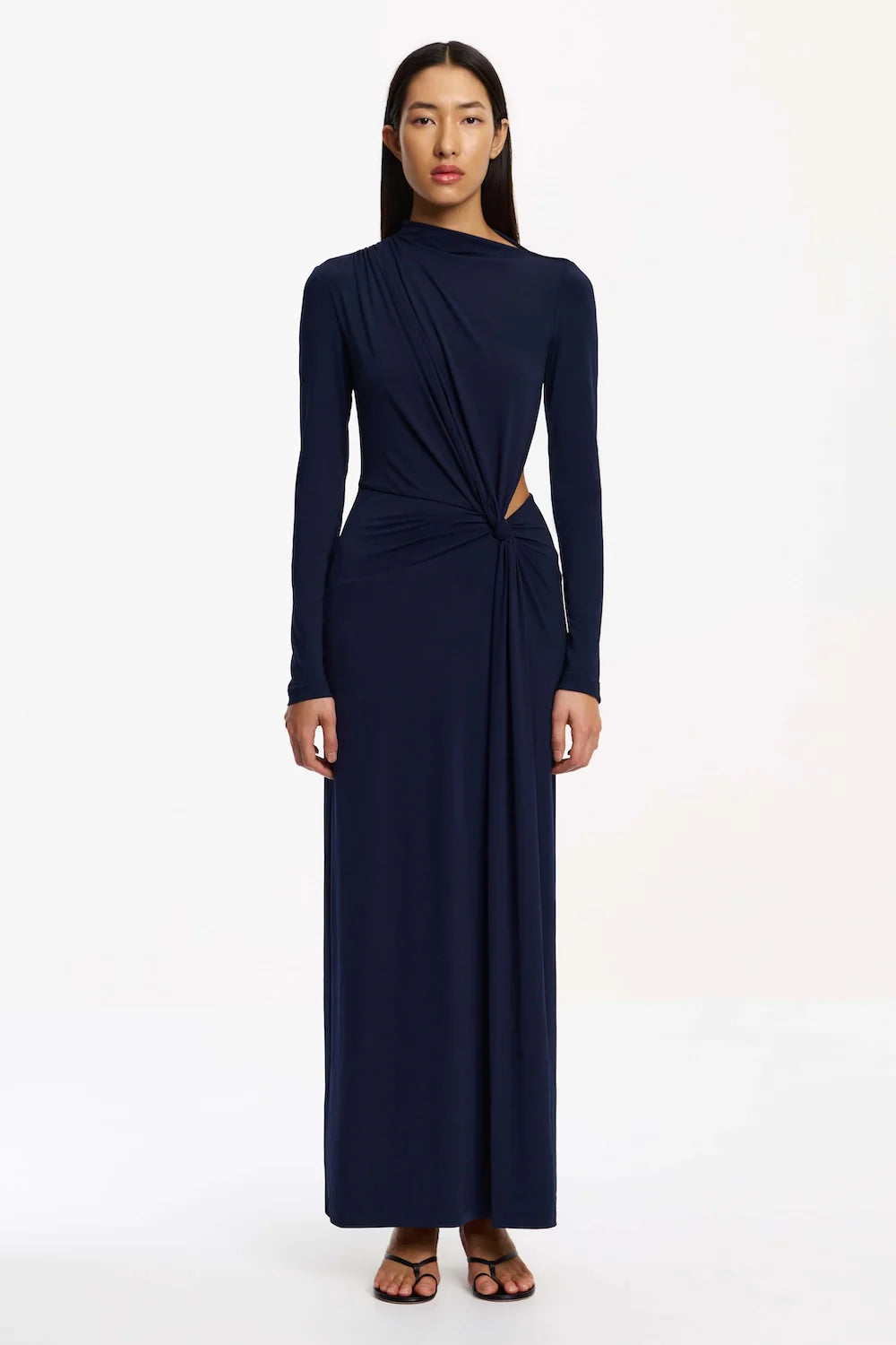 The June Long Sleeve Maxi Dress in Midnight strikes a balance between sculptural elegance and contemporary sophistication. Crafted in lustrous knit jersey, this floor-skimming silhouette features an artfully draped asymmetrical neckline, soft gathering at the shoulder, and a defined waist knot. An unexpected, elongated back cutout wraps around the side, offering a modern statement for formal events and elevated evening occasions.