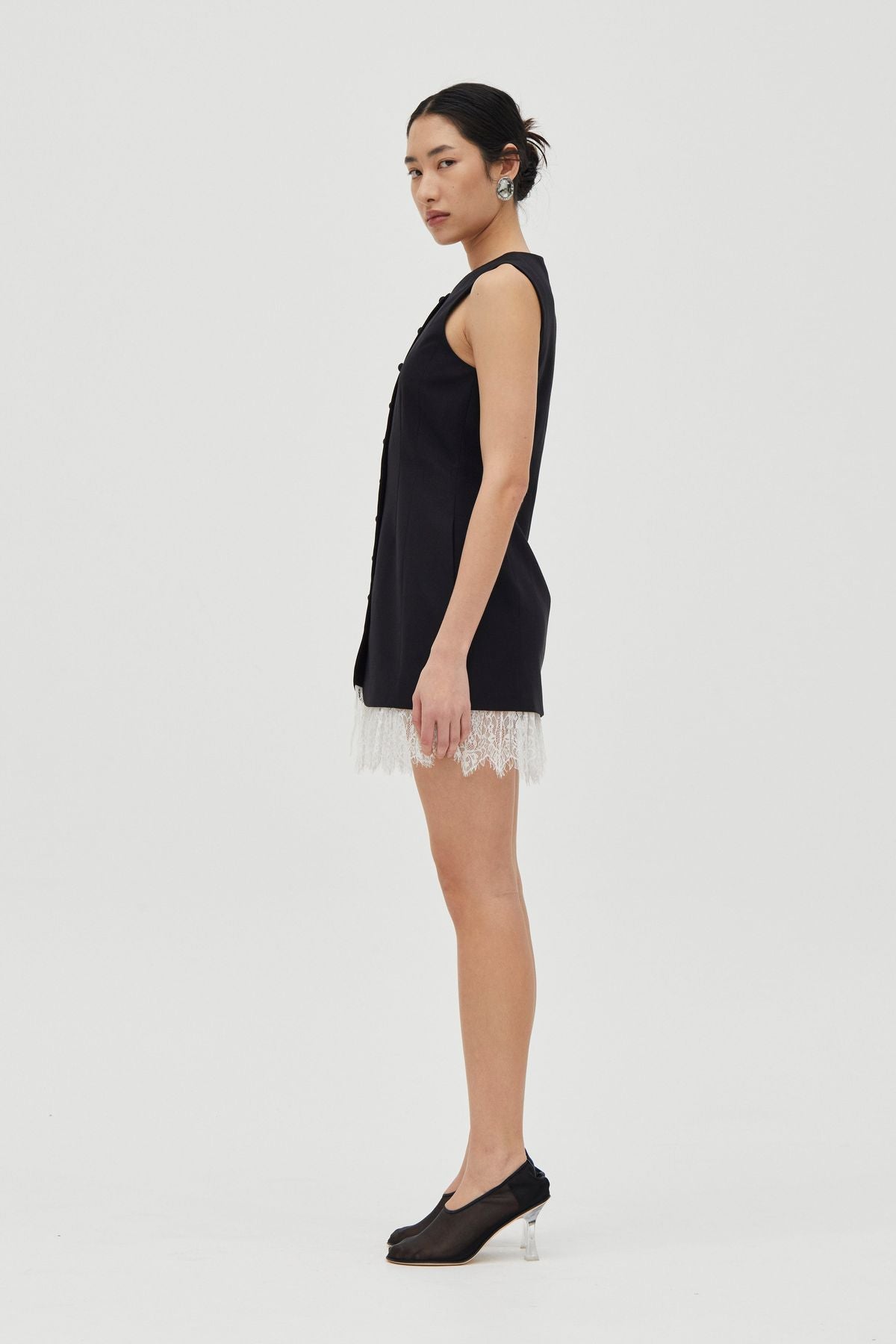 The Nocturne Lace Trim Mini offers a refined take on contemporary tailoring. Defined by a soft round neckline and a tailored fit through the body, it features a centre-front fastening with self-covered buttons. It’s finished with a pleated lace trim hem that introduces contrast and softness.