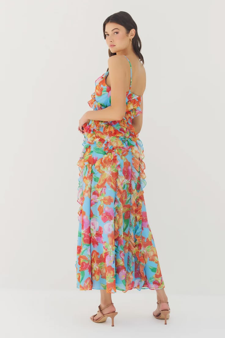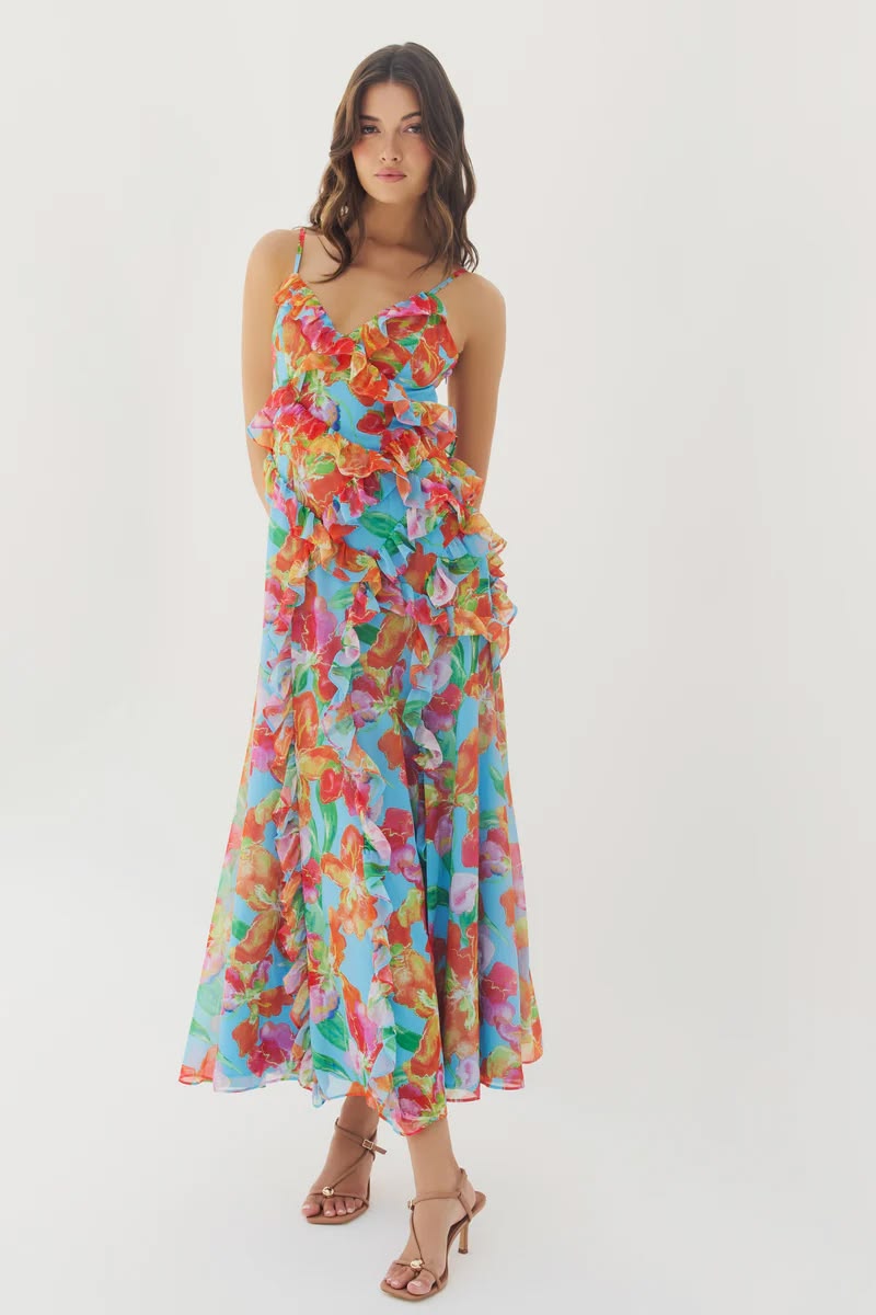 Sleeveless ruffle trim long dress