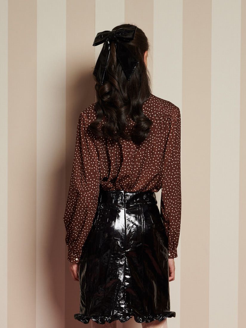 The Knick Knack Ruffle Blouse, with playful dots and ruffles, feels as charming as your favourite teacup. Loose fit blouse in a woven polka dot print fabric. Featuring a grown on necktie with a ruffle finish. Detailed with gathered yoke seams and pearl buttons to fasten
