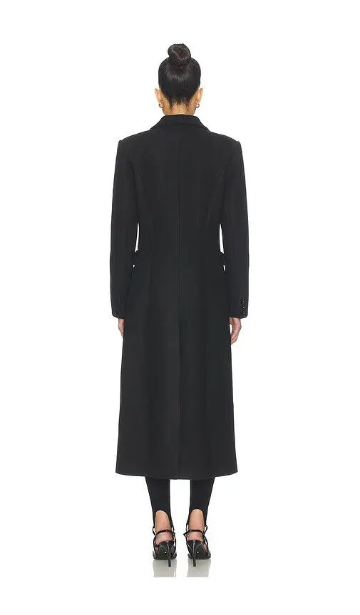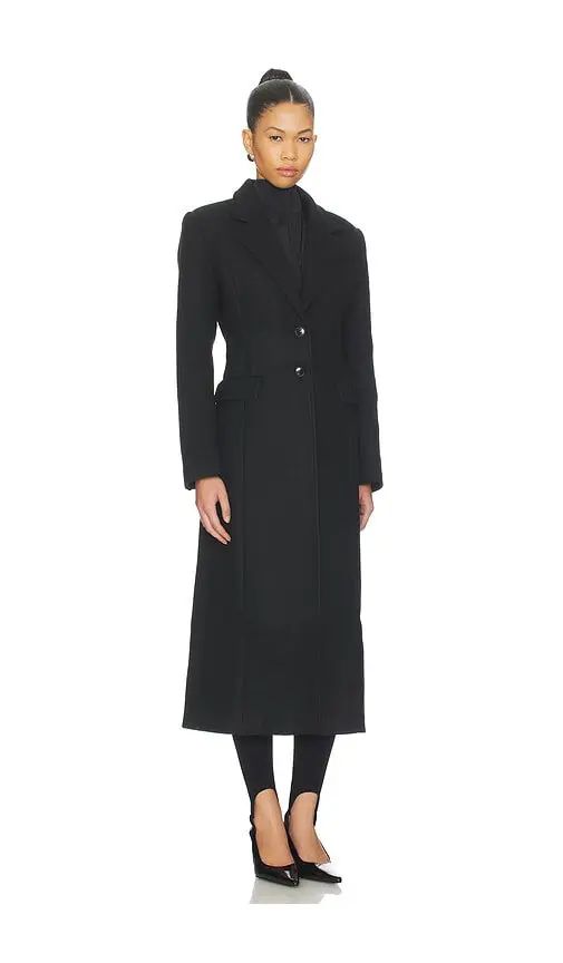 The Elodie the Label Cindy Coat features a button closure, front panel pockets, shoulder pads, back split vent, and buttoned cuffs. This coat is crafted from 100% polyester and made in China. It should be dry cleaned only.