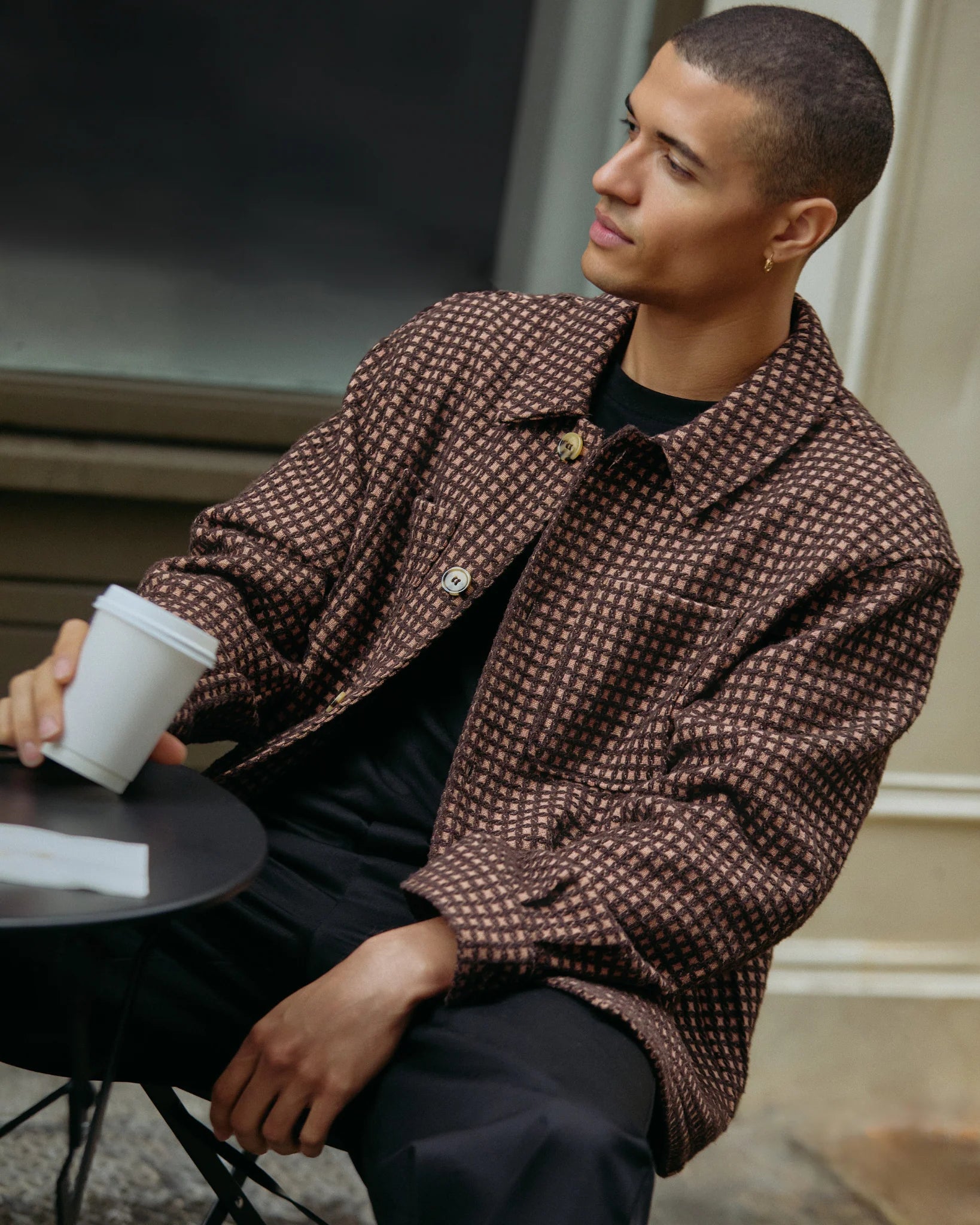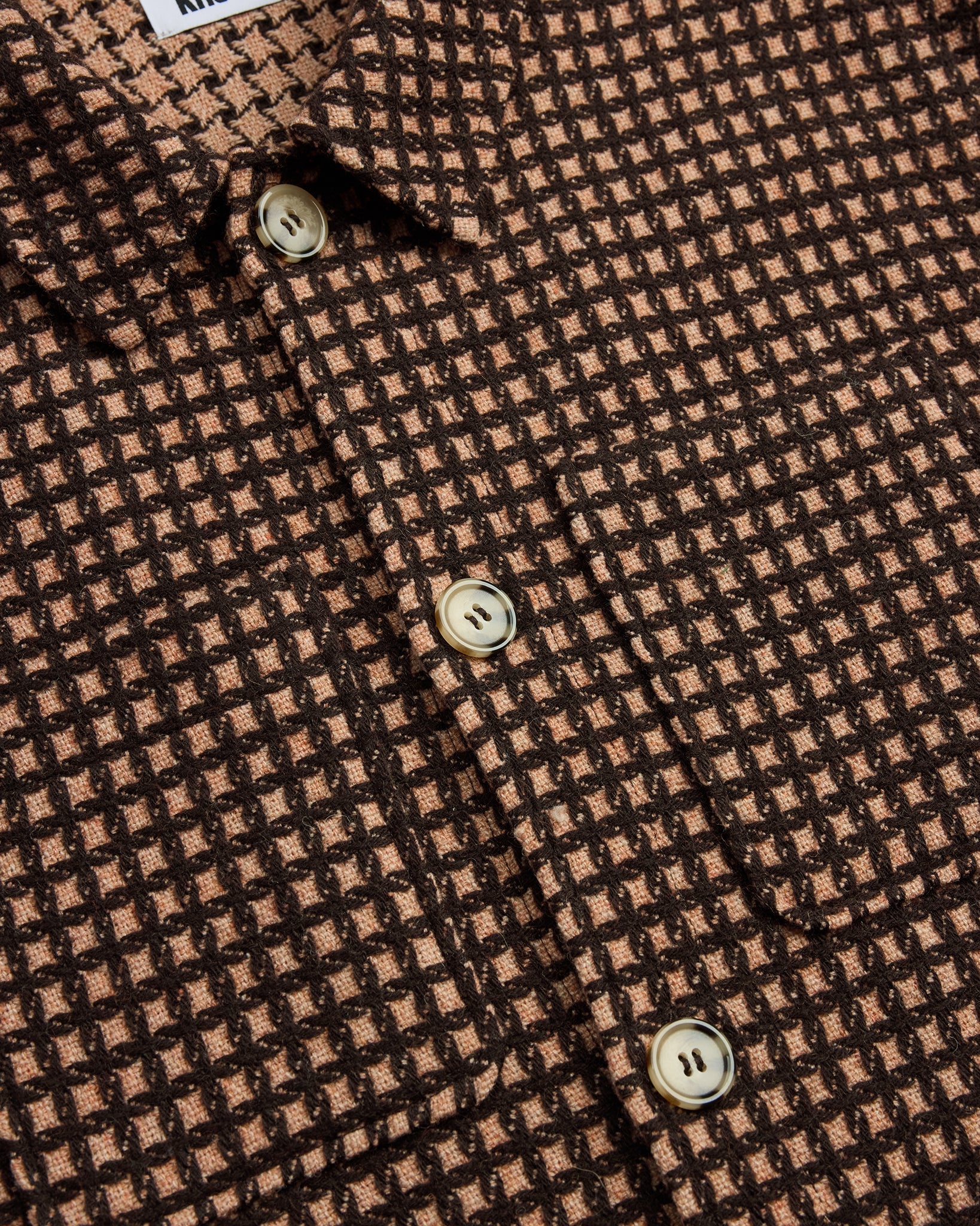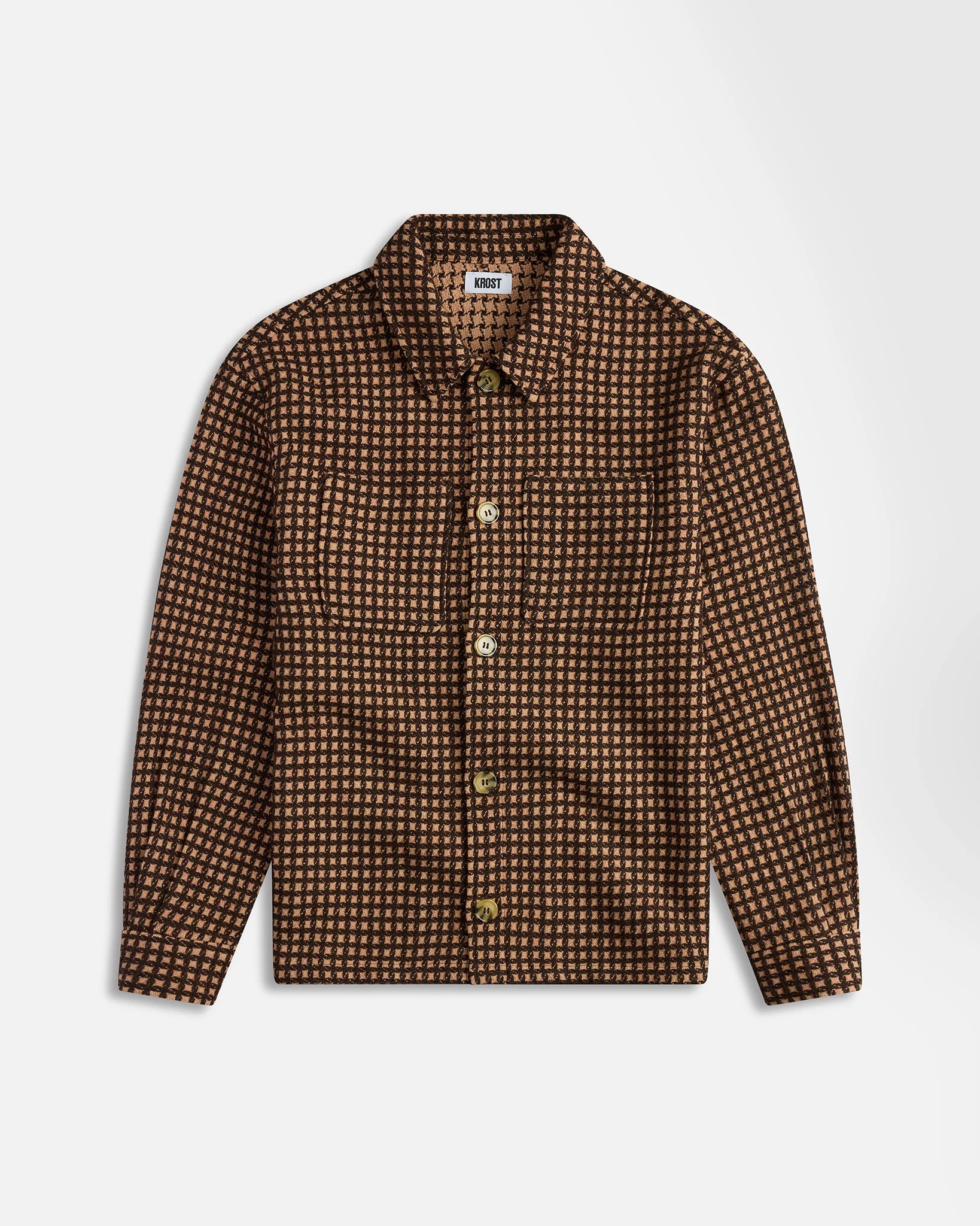 The Wool Check Overshirt in Golden Straw offers a relaxed, boxy silhouette with a timeless workwear feel. Crafted from a recycled wool blend, it features a pointed collar, dual chest patch pockets at chest, and a straight hem. Dropped shoulders and buttoned cuffs round out the design, making it ideal for layering through the colder months.