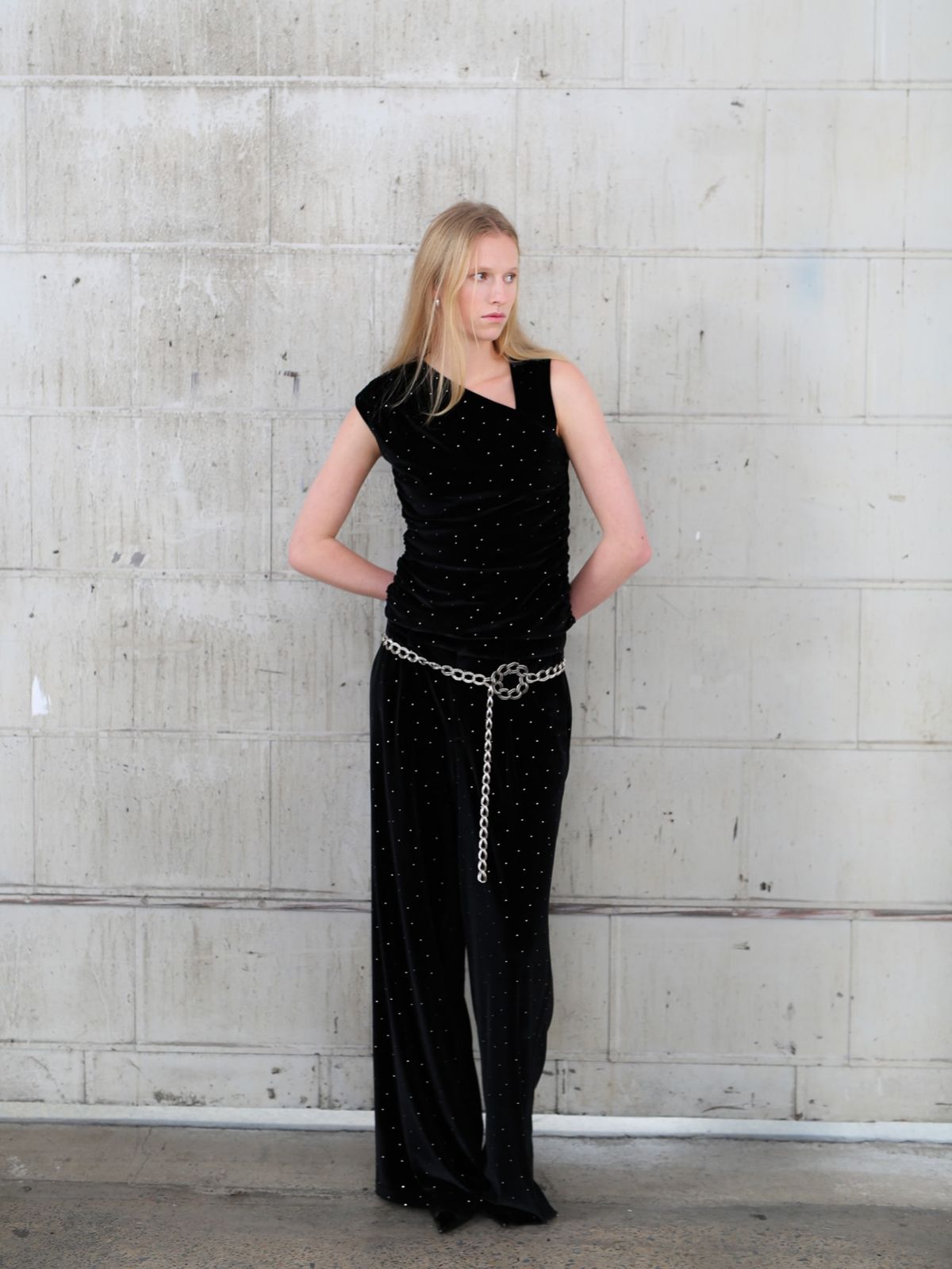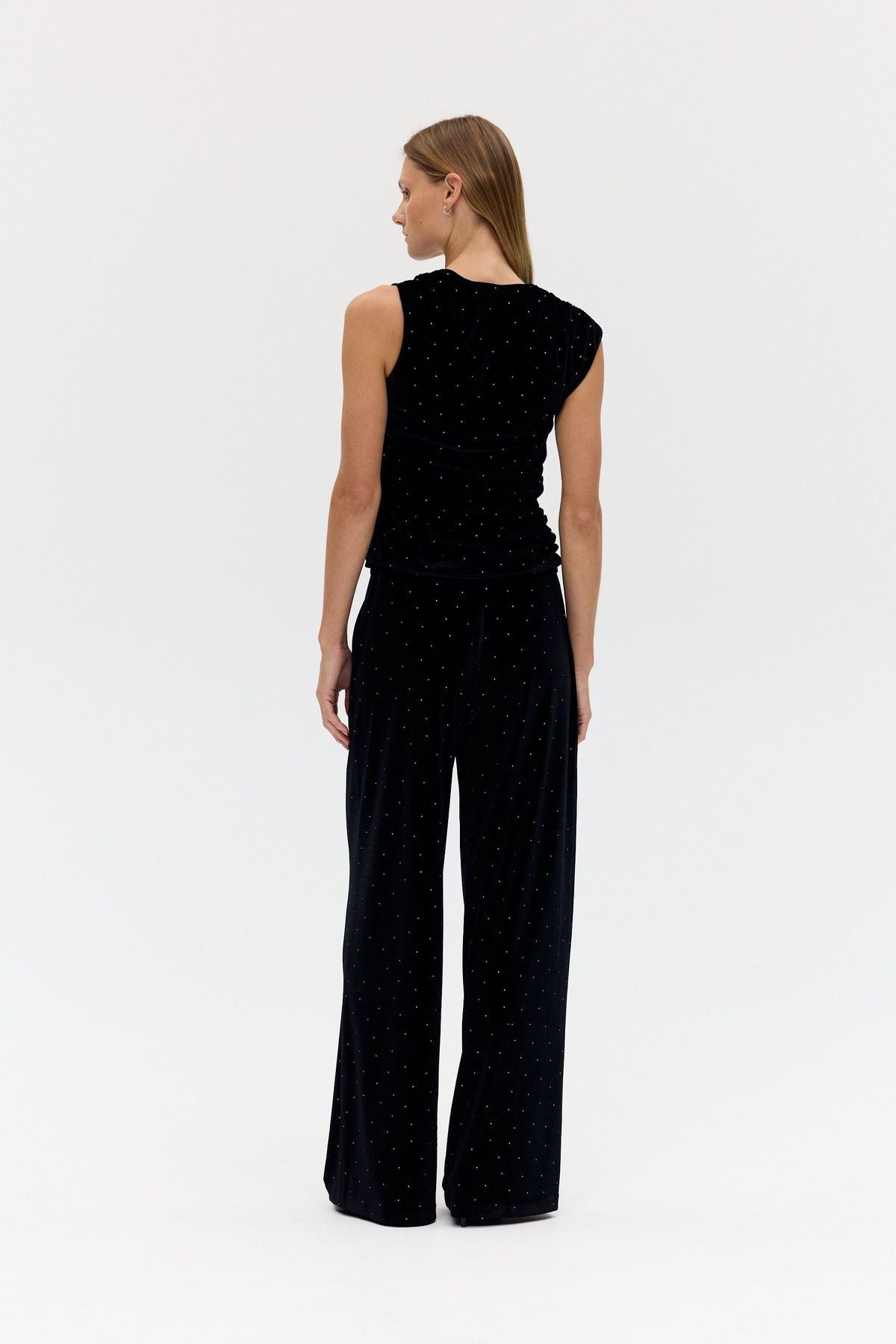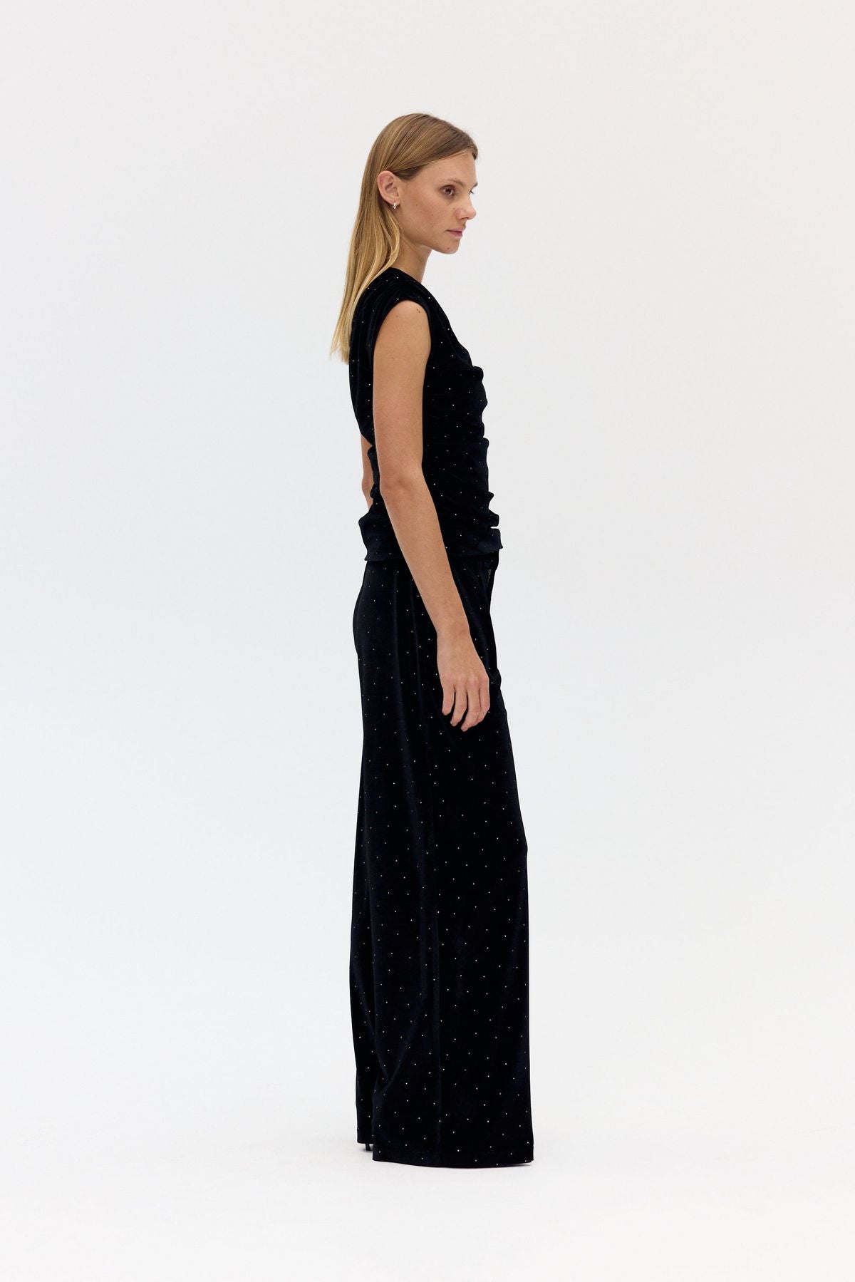 The Spark Ruched Tank is cut from crystal-embellished velvet, bringing texture and light to a fitted silhouette. An asymmetric neckline and gathered seams contour the body, while a concealed side zip ensures a smooth finish.