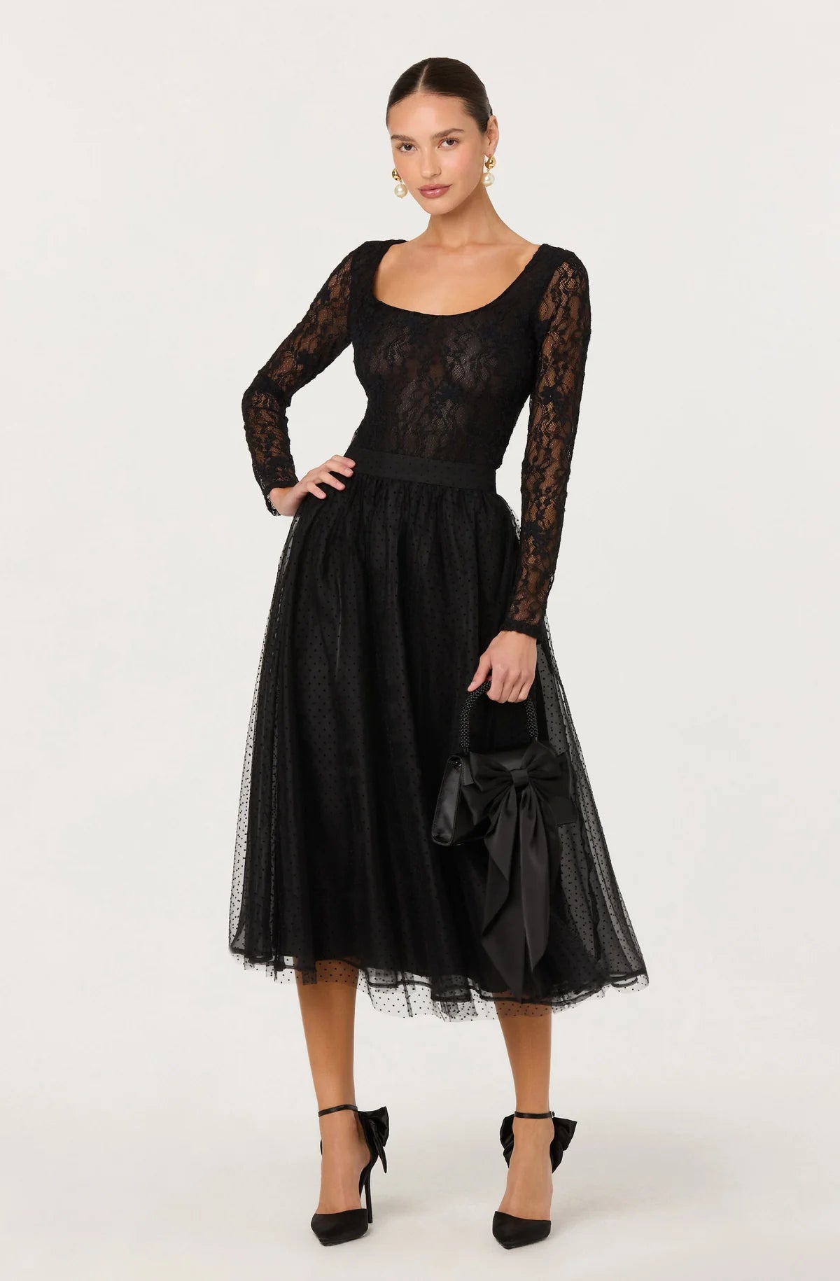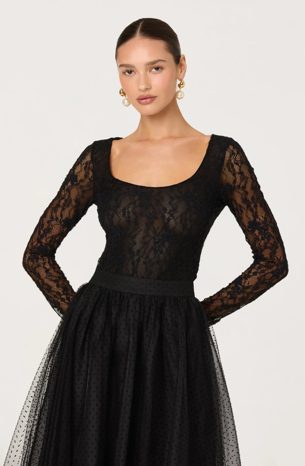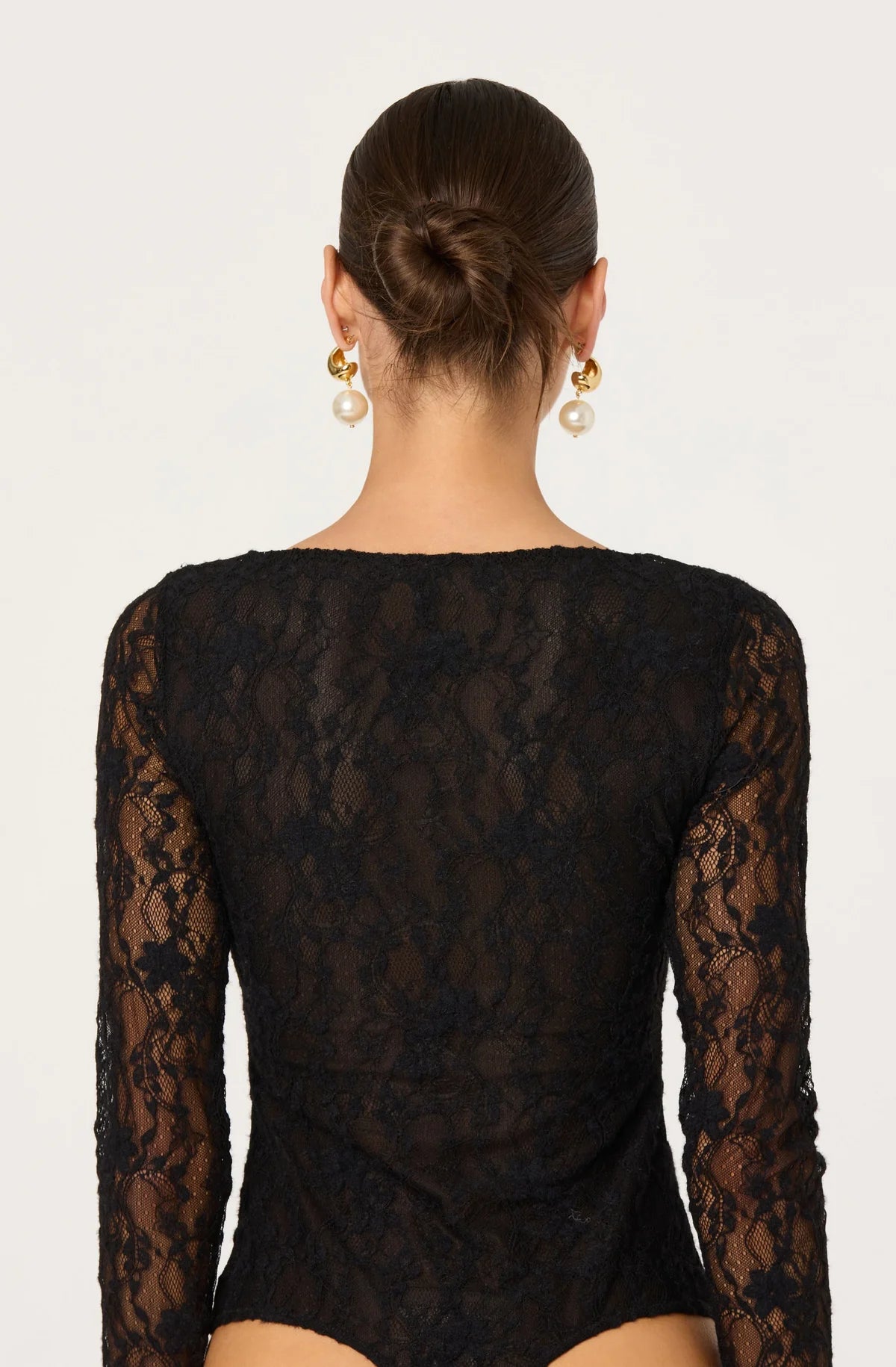 This long-sleeve bodysuit features delicate lace with a scoop neckline and fitted silhouette. Designed to flatter and layer, it blends sheer texture with refined tailoring making it perfect for elevated evenings, dressed-up dinner, parties and a night out with friends.