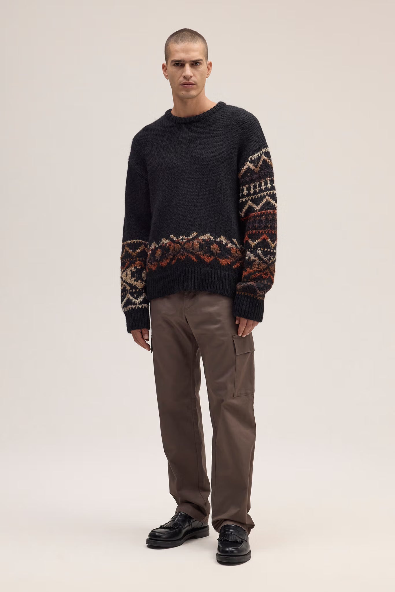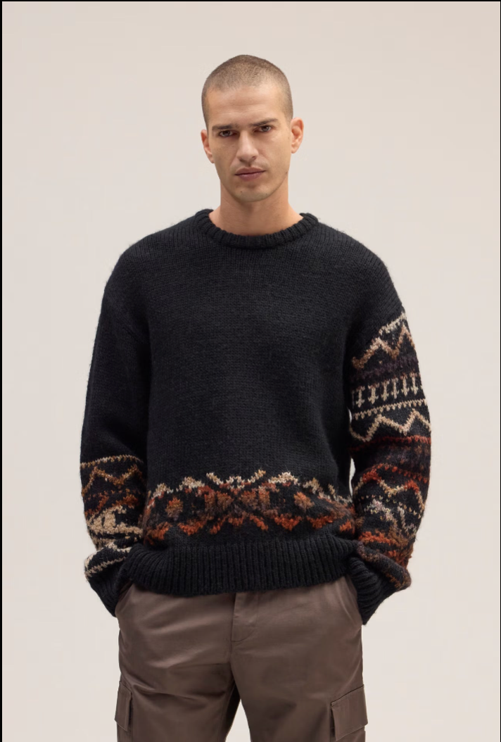 Relaxed-fit crew neck sweater crafted from a medium-weight woolen blend for a soft, textured hand feel. Features a chunky knit with an irregular pattern for a bold, playful look.